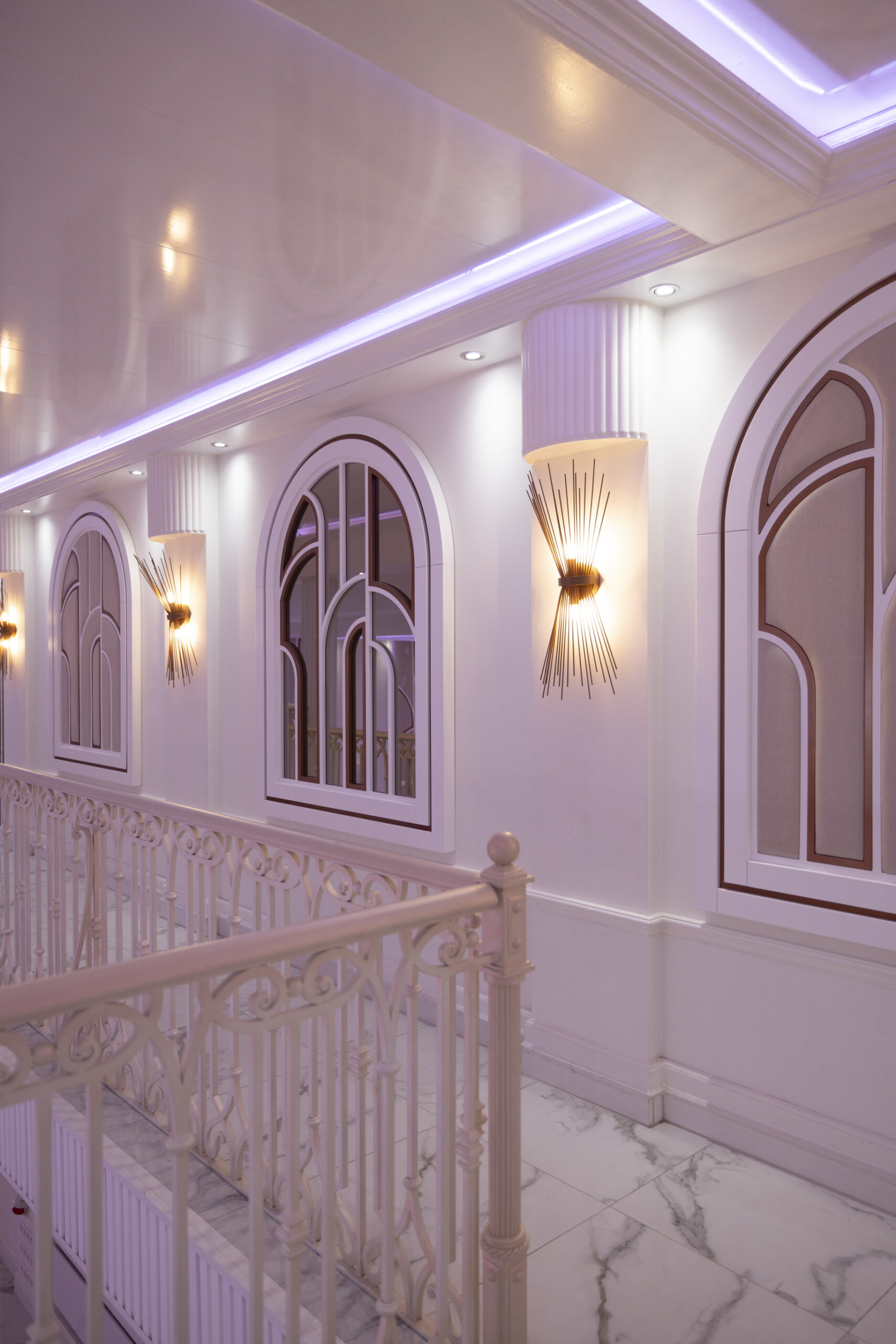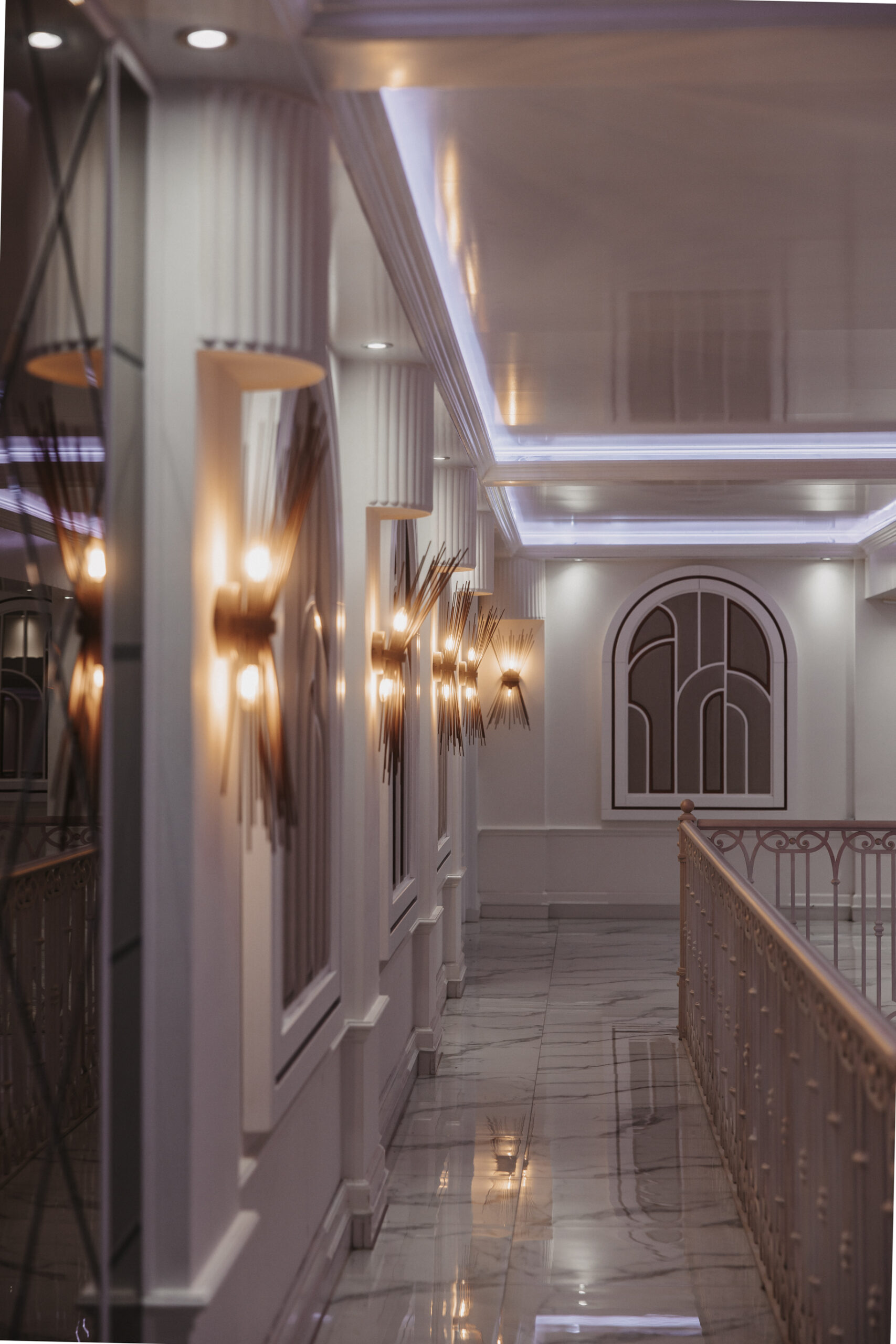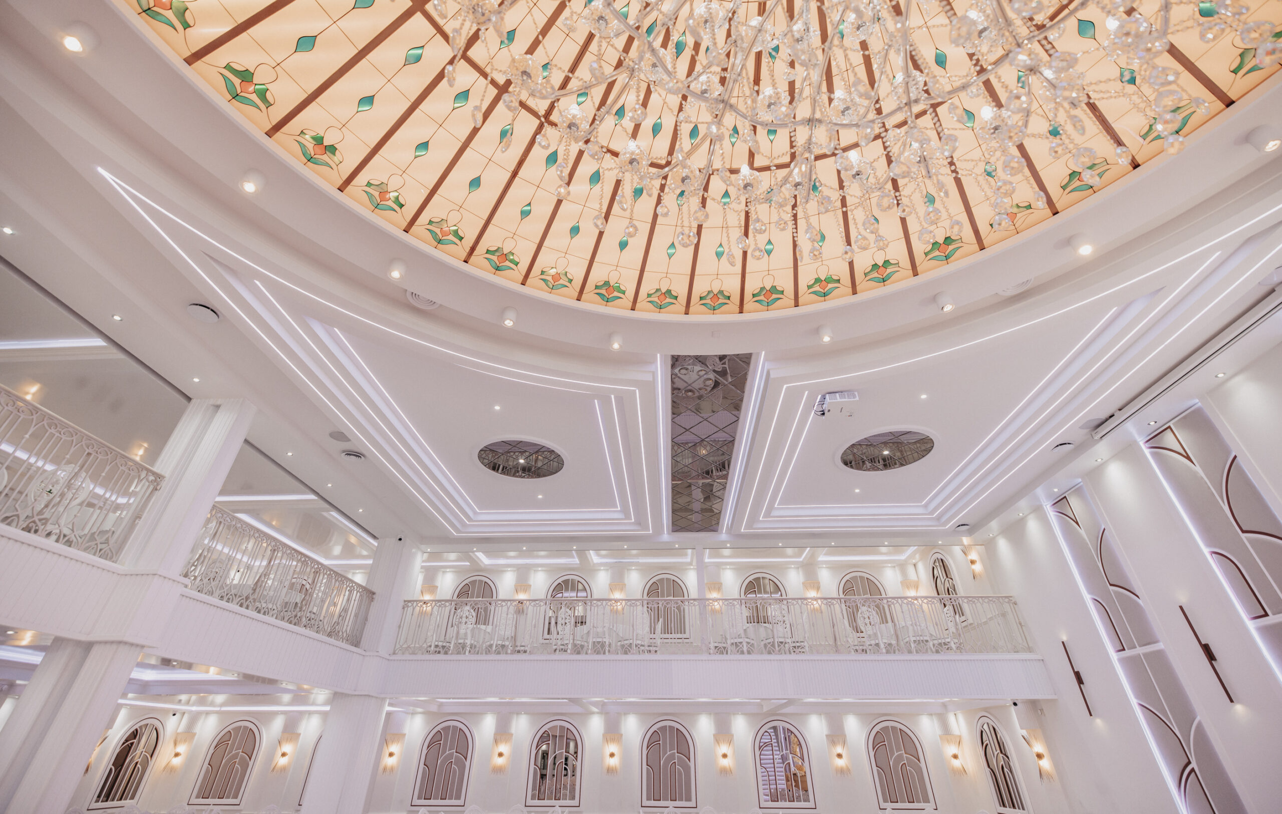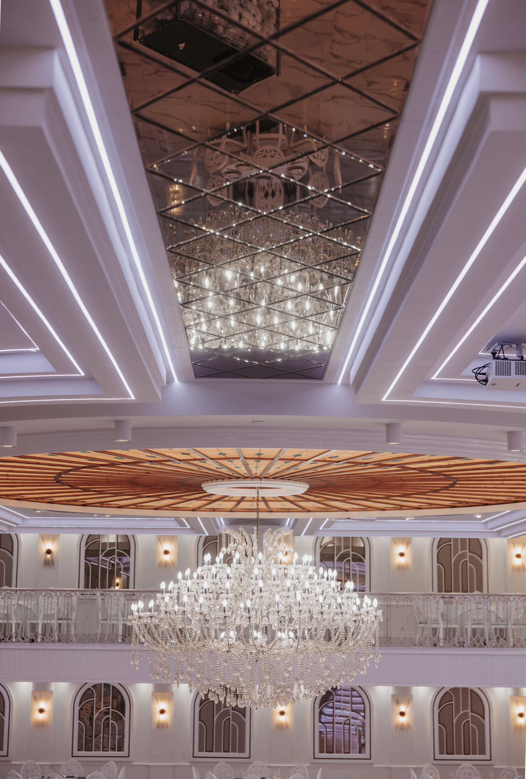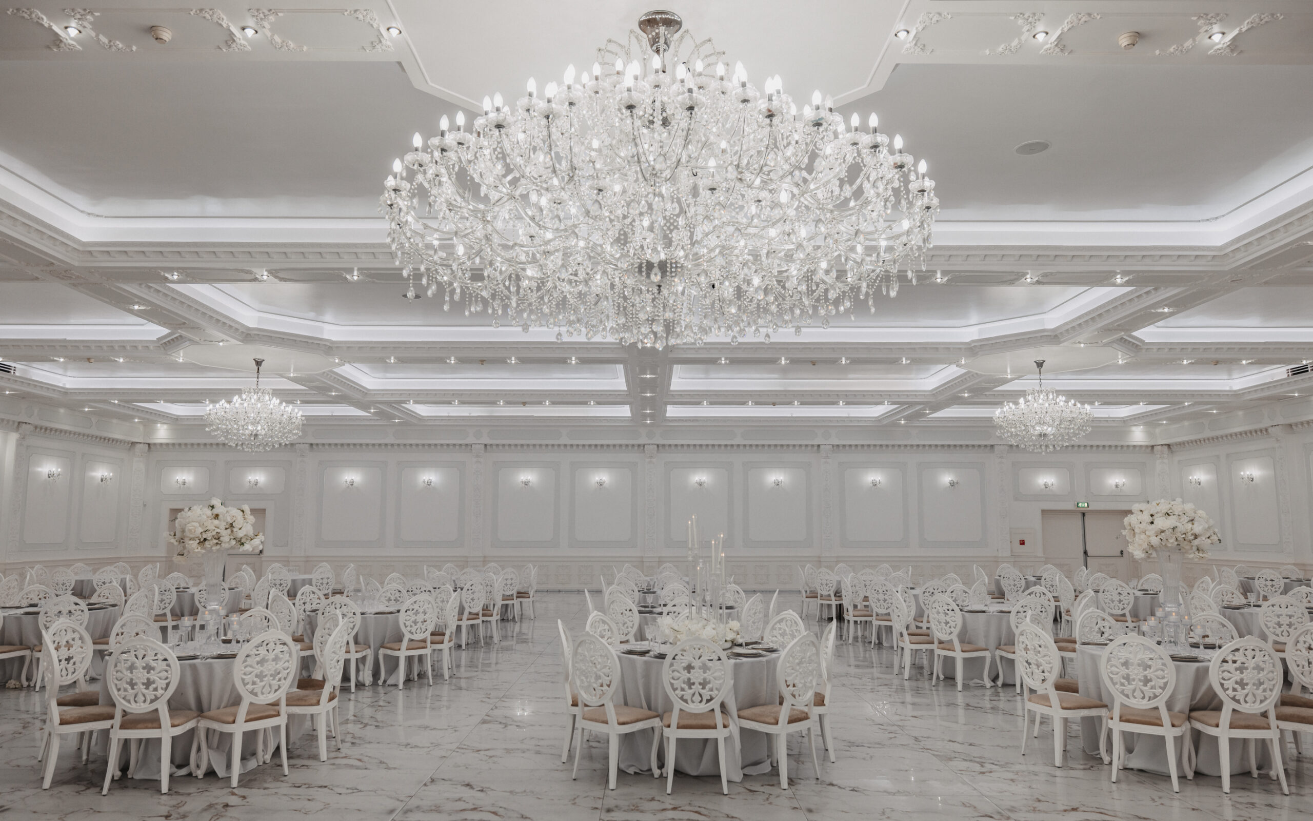 Een erg mooie grote zaal! Leuk interieur van binnen, net zo n ballroom als van assepoester. Ook hangt er een schitterende kroonluchter midden op het plafond!
